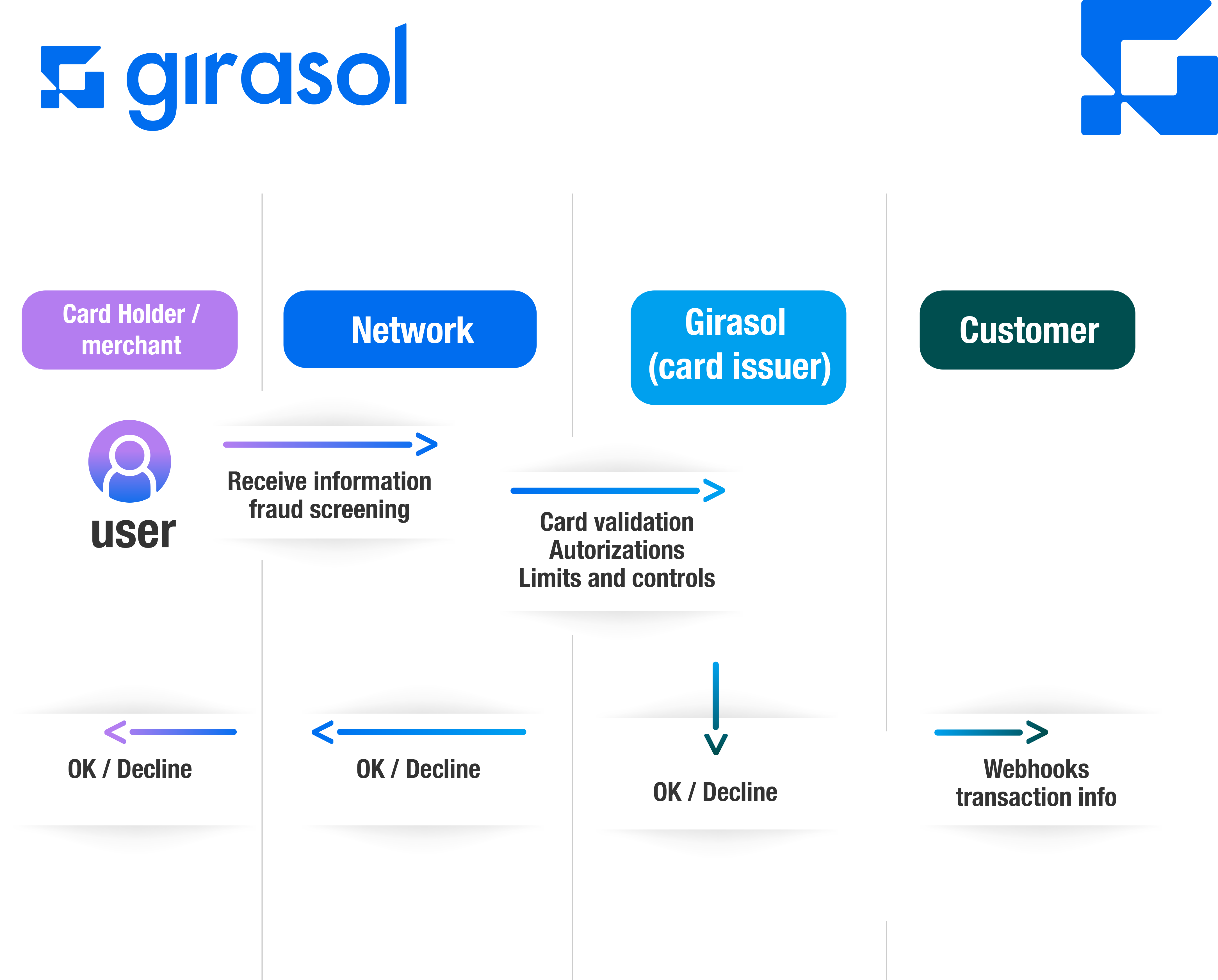 These diagrams are designed to help developers, partners, and integrators understand Girasolās end-to-end card issuance and transaction authorization flows under our Co-Applicant / BIN Sponsorship program. They illustrate how data moves through the network, how validations occur, and how our platform ensures compliance, control, and efficiency at each stage.
