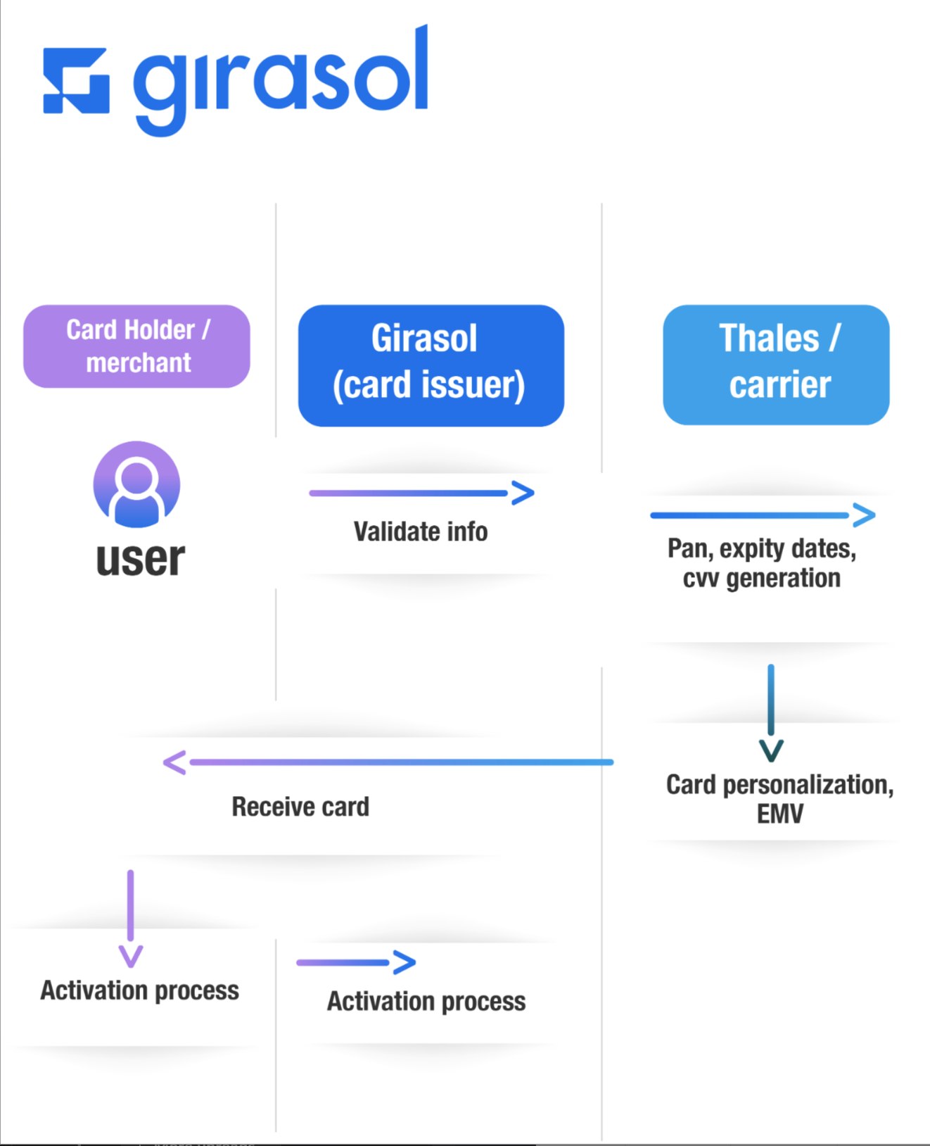 This flow illustrates how Girasolās Co-Applicant/BIN Sponsorship solution enables This flow describes how a new card is created and activated within Girasolās Co-Applicant / BIN Sponsorship solution. It outlines the interaction between the user, Girasol, and the card manufacturer (Thales), covering every stage from validation to activation.